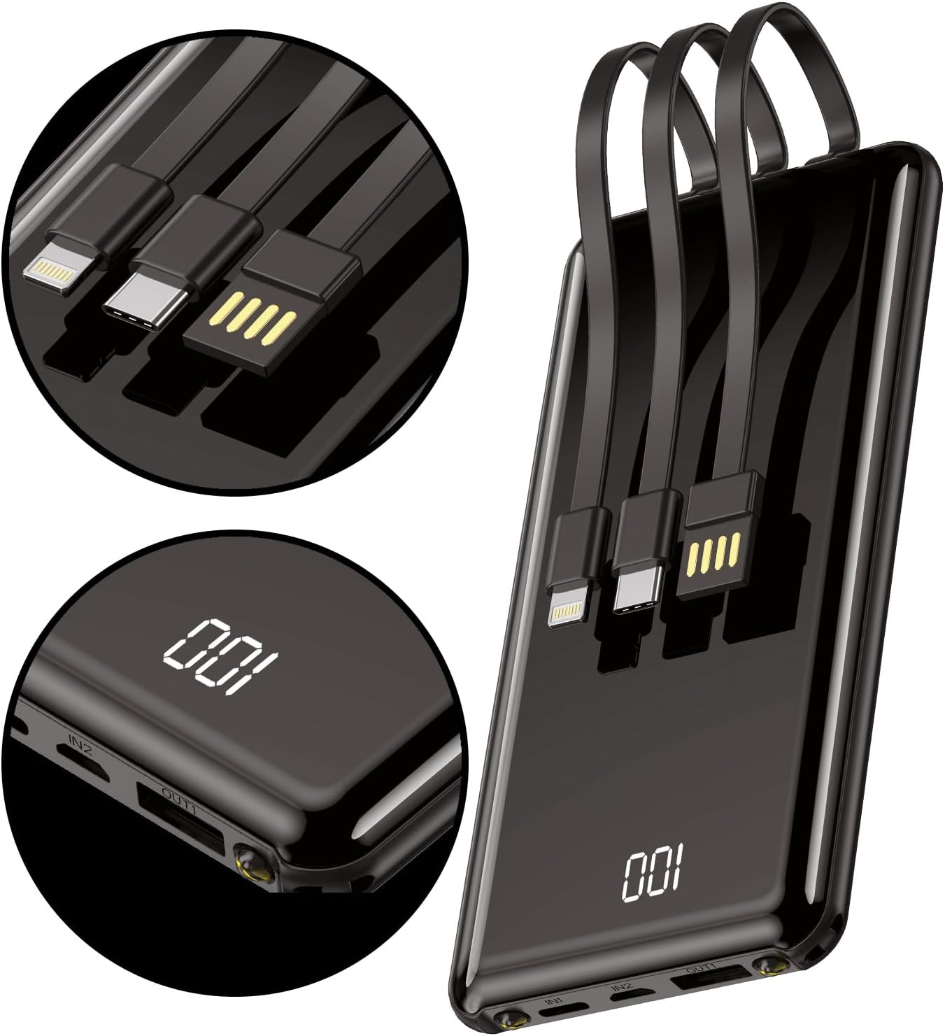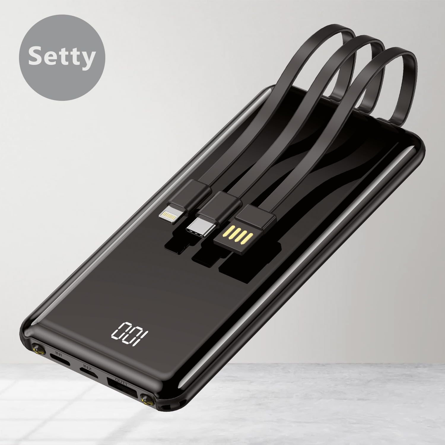 SETTY powerbank, Power Bank. 10000 mAh, LCD akku Ladegerät mit integrierten USB-, USB-C- und Lightning-Kabeln, 2 Anschlüssen (1X USB, 1X USB-C), kompatibel mit alle Smartphone, Handy, Farbe: schwarz